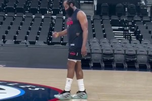 身先士卒!哈登是今天快船训练到最晚的球员,整个球场只剩他一个